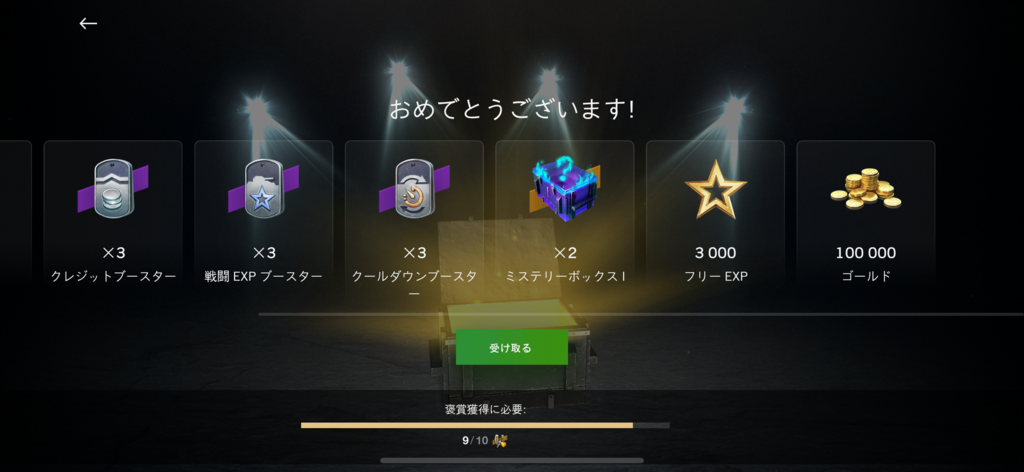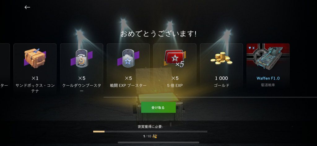 イベント「アフターパーティー」で無料で貰える全て集めようコンテナ✕3個から、TierⅧ_WZ-111+1,000Gが出た。