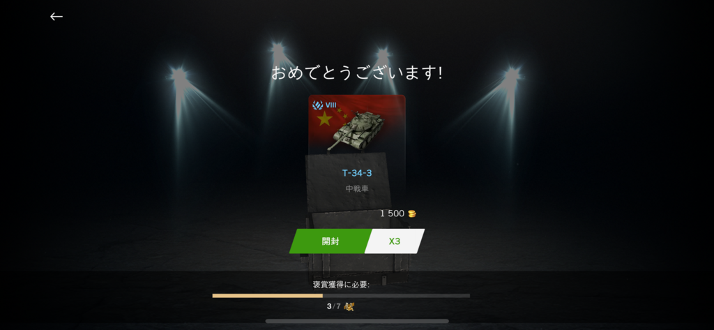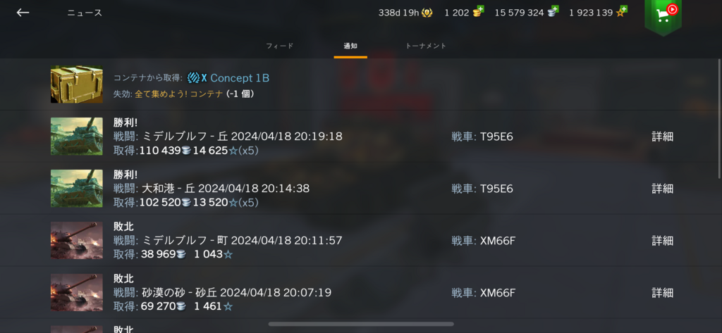 マッシブくじ滅茶苦茶しょべーけど運でなんとかなったわ。13回目まで開けて1.6万ゴールド浪費したけどそこで出た全て集めようコンテナからT-34-3で3750ゴールドの補填。最後にミッションケースが出てミッションは10戦参加の1全て集めようコンテナでこれまたしょべーかったが秒でクリアし開けてみるとConcept1Bを獲得。Concept自体はガレージに無いだけで所有済みだったがこれで7500ゴールドのバック。 ただ滅茶苦茶運が良くてもまだマイナスだからこのくじは全くオススメできない。明らかにサプライズくじで配布したゴールドの回収に来てる。