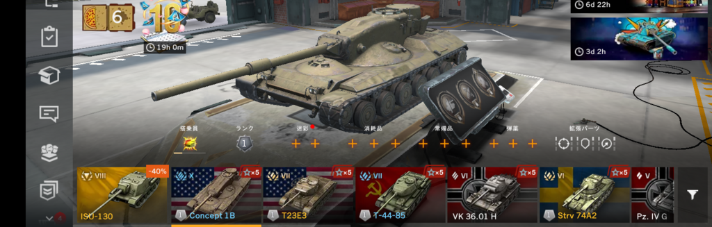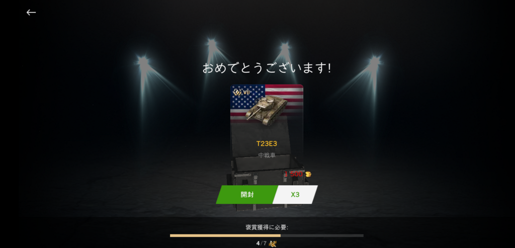 Android動画視聴で貯めた200G原資で、マジつよラッキーくじ引いたら、グランドサプライズコンテナ3個引いて、Concept1B(7,500G)、T44-85(2,500G)、5,000G(くじの最初に引いて+クジ原資にした)、全て集めようコンテナからT23E3(プレ車)が、出た。