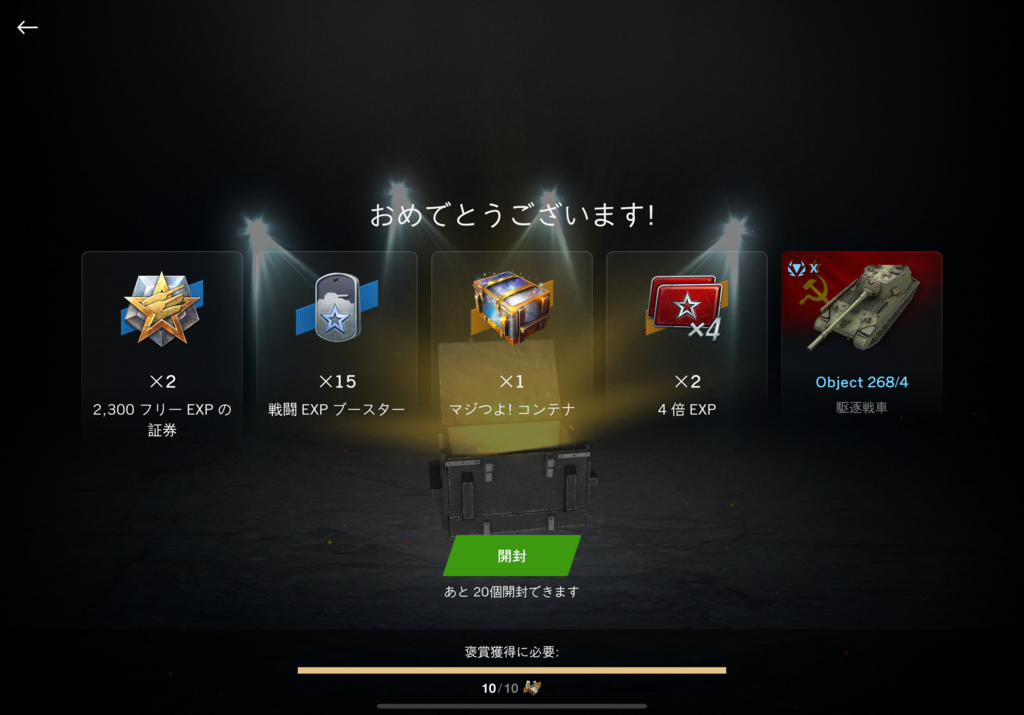 マジ強コンテナ2周目。12回目で真ん中当たったのと、10,000ゴールドが2回出てくれたのでゴールド的には約1万プラスぐらいで終われてホクホク。プレ垢も通算1200日ぐらいまで延びたからこりゃあやめられんね笑