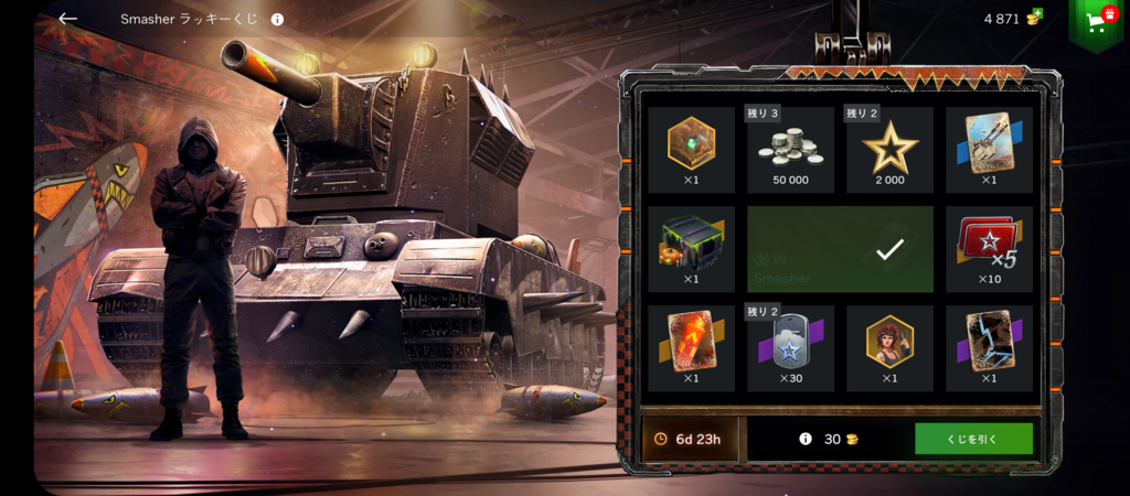 多分100くらいの数のボックスを開けてscepterとその迷彩、0.19%の2500G をゲット。そしてその直後にきたスマッシャーくじの2回目でスマッシャーも...