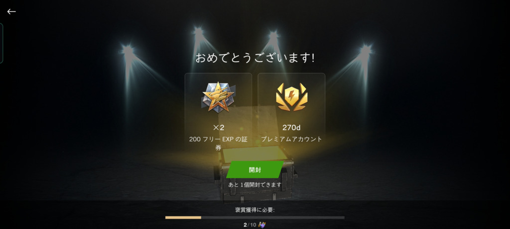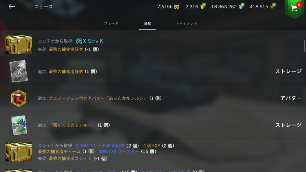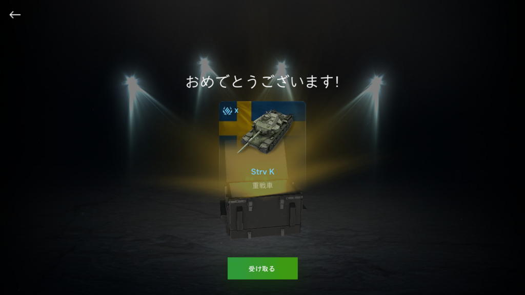 Tier10証券ラッキーくじ結局いつも通り最後まで回して証券ゲット。証券からはStrv Kが出て、コンテナからは少しのゴールド以外めぼしいものはなし。かかったゴールドは戻ってきた分(Strvの売却価格は含まない)を差し引いて、20000Gほど。Strvは欲しかった戦車だから普通に嬉しい。それに、新しめの戦車で再販されるとしてもCarro並み価格だろうから、おまけもついてこの価格はお得に感じた。ただ後々気づいたことなんだけど、実はTier10証券の中で持ってなかったのがもうStrv、777、V4しかいなくて、危ない橋を渡ってたと知ったときは冷や汗かいたね。マジ強コンテナ外しまくって運貯めておいて良かったー。