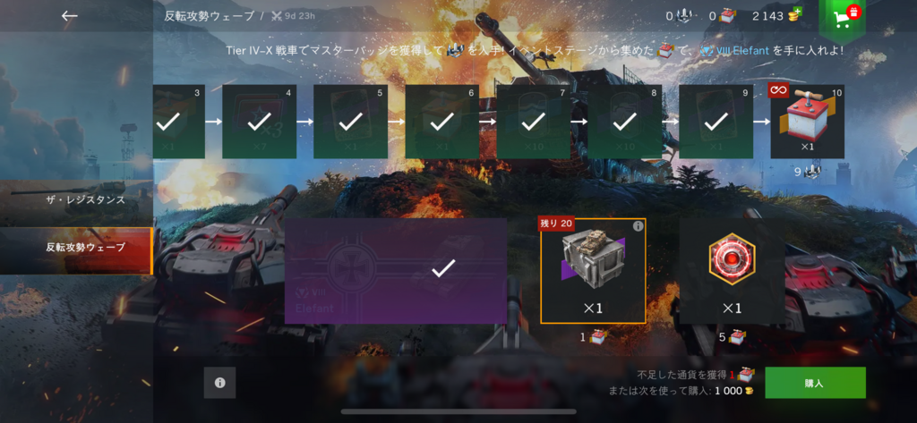 期間も長いし買わなくても楽勝イベントでしょ。無課金でも起爆スイッチ10個とコンテナチャーム20個の両方取れるから、戦車+3,750G+ゴールドブースター+2%当たりでうまうま。1日23エンブレムくらいで戦車2両確定のはず。