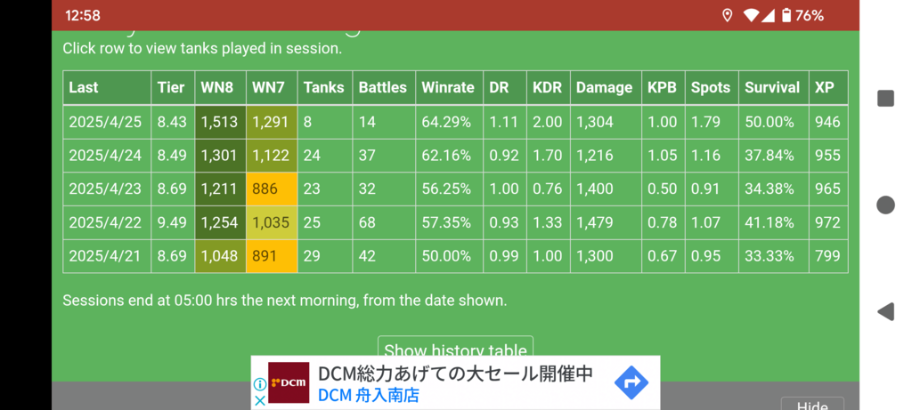 でも色々見てて思うけど単に勝率だけで良し悪しを決めつけてる人が多いなとは思う。自分が常にいい動きしてるとは思ってないしどちらかと言うと上手い人から見たらヘタだとは思うけど上手くなろうと色々研究はしてる。上にも直近の戦績上げたけど今は5万戦で勝率45.89%だけど今日の分を更新したのはこんな感じ。今はいくら頑張っても中々トータル勝率上がらないんだよね。