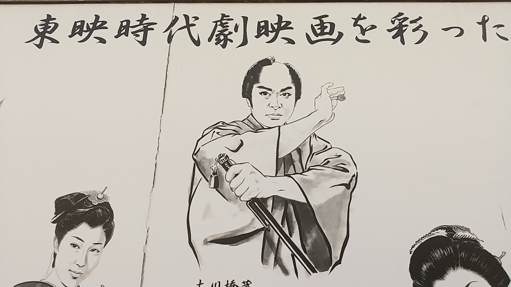 “ 時代劇映画を彩ったスター” の似顔絵の方は、中央に橋蔵さんの絵があり、全体ではありませんが撮れましたので、違う角度の写真も併せて追加させていただきます。