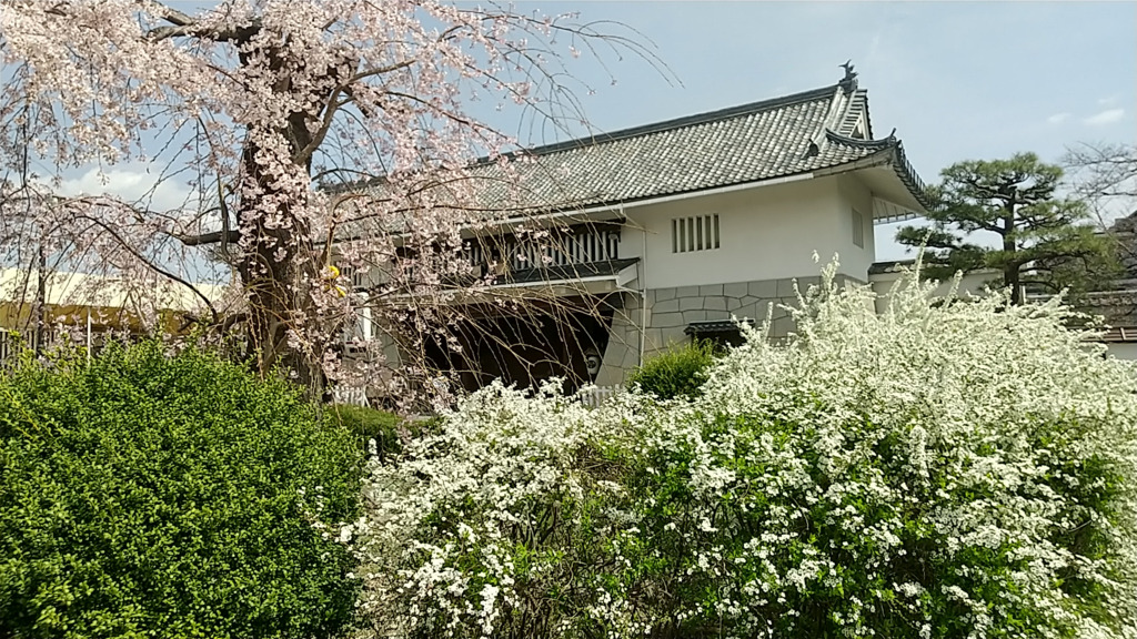中央広場の枝垂れ桜が満開で東映城大手門に映え美しかったです。
