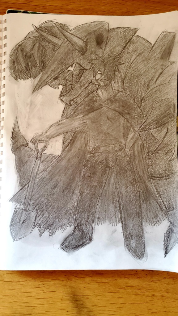 ミオシティミオジムのジムリーダー、ドウガンです。本来彼の相棒はトリデプスなのですが、あいつ体長130cmしかなくて映えないので、代わりに控えのボスコドラを描きました。マントをはためかせて仁王立ちする男と、背後で轟く大型系が描きたかったのです。