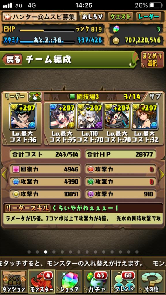 闘技3周回の幽助パ風神3枚入れるか悩みますね 今はこんなんで遅延対策 風神 嫁カマリ 水回復光陣 風神って感じ 3枚入れた方が安定するよなー 嫁カマリ抜いて風神継承とかかね うーむすぎる