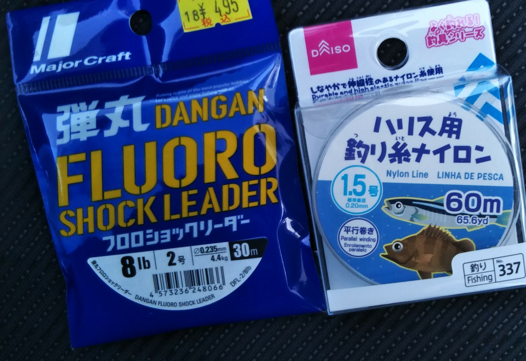 釣具屋で購入したフロロカーボンラインのハリスとダイソーで購入したナイロンラインハリス、今度テストしてみる。