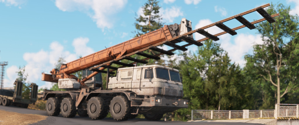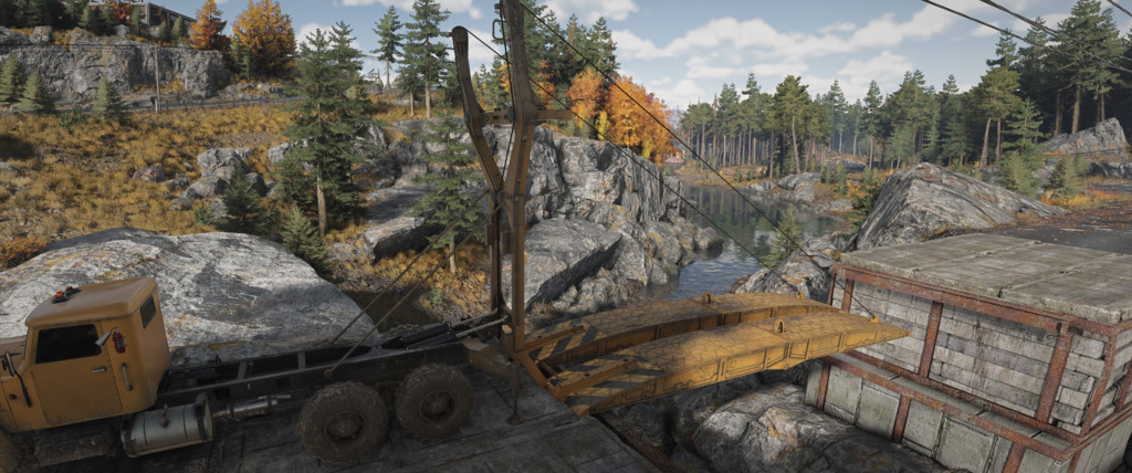 大洪水マップの工業拠点から北へ向かった先にある生産工場にある金属がやたらあるところです。(写真は片付け後です。タワークレーンから奥へ水辺へ向かう方向です。)セミトラックだけでなく通常のトラックでも狭いところは荷物固定ができません。