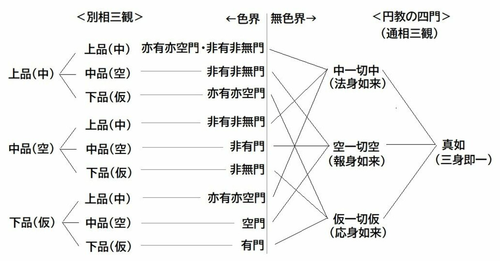 十如是は円教である『法華経』に至ってはじめて明かされる法門ですので、智顗は三乗の教えを別相の「次第三観(別相三観)」として相待妙としての「三種・三観」を立てます(①~③)。その九項目に開かれた別相三観をベースとして、円融の「通相三観」④が絶待妙として起こります。