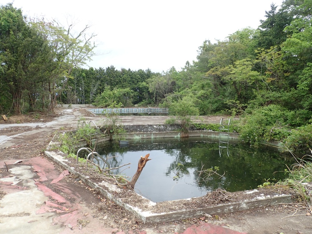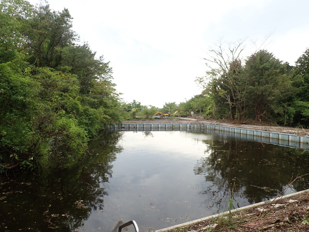 「廃プール」 >> 347の廃墟群の一つです。数年前まで更衣室と食堂の入った建物があったんですが、撤去されてました。というかここ一週間の間に解体されたような雰囲気。重機も止まってますね。