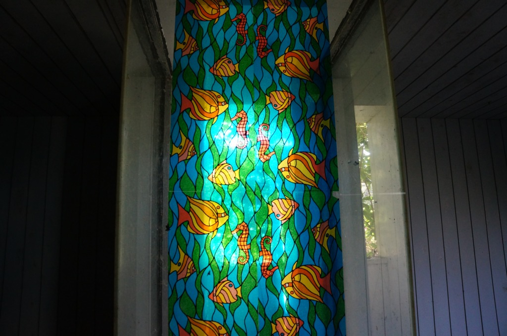 ガラスに申し訳程度に貼られている昭和丸出しのステンドグラス風フィルムが哀愁を誘う