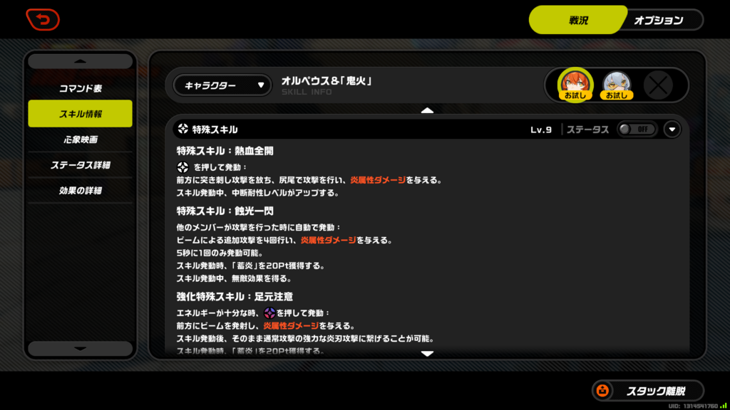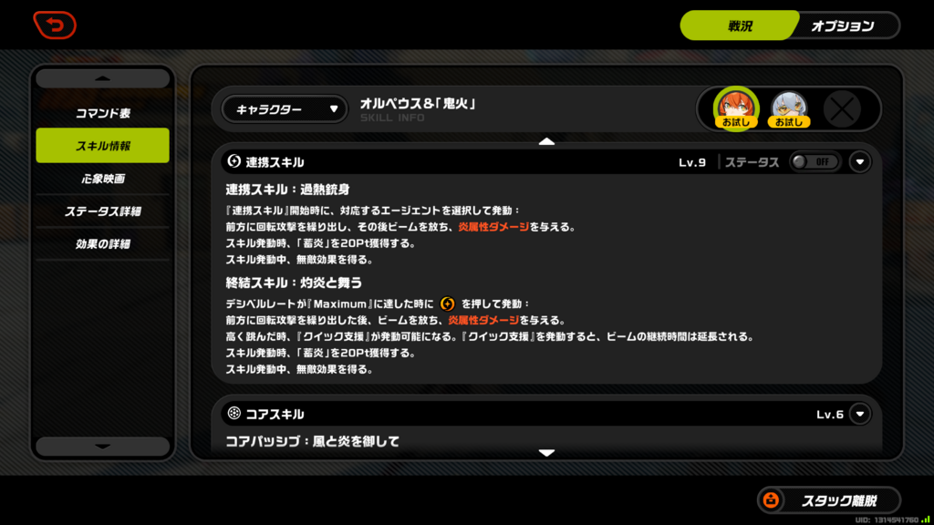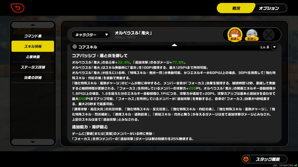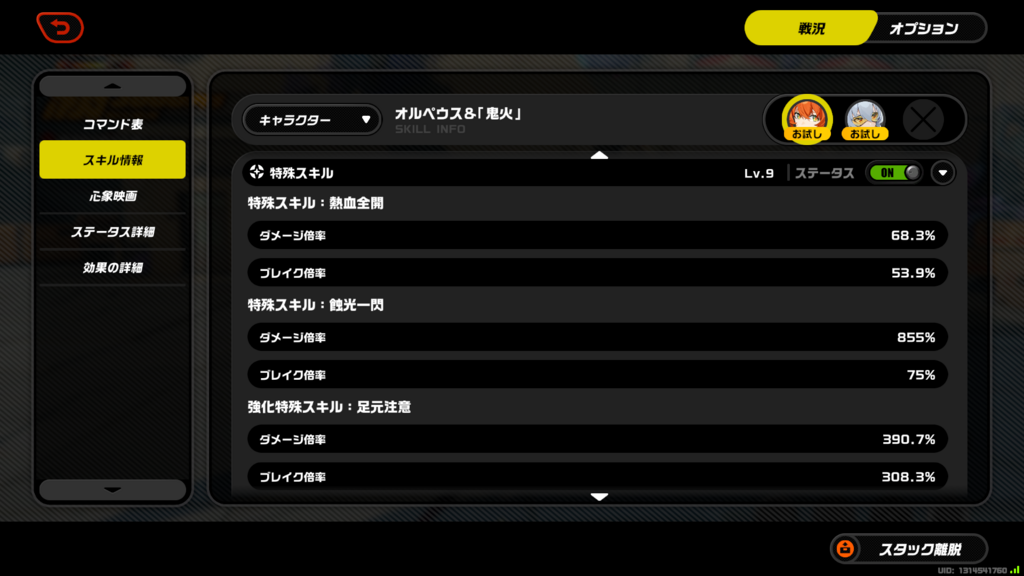 心象映画1~3、心象映画4~6、コアスキル、特殊スキル1、特殊スキル2、特殊スキル倍率1(Lv9)、特殊スキル倍率2(Lv9)、連携スキル、連携スキル倍率(Lv9)