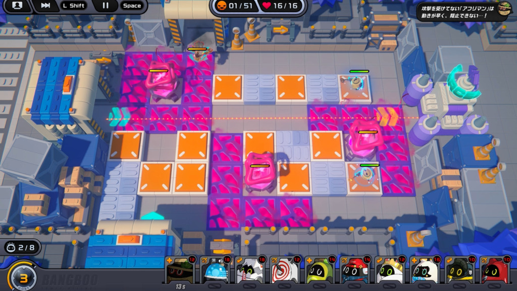 タワーディフェンスの最終ステージだけ満点取れなかったけど敵の数と攻撃のエフェクトが酷すぎて状況把握出来なくなるのが一番きつかった。ボンプの生死把握出来なくてもう満点いいやってなる。