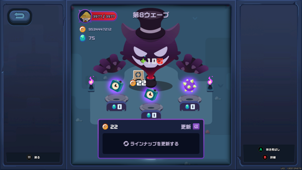 (前回は重ねまくってた上で9ショップ更新が酷くナイトメア15個でラッグラグ、今回ショップは正常で「攻撃時コイン追加獲得」を5体確保しナイトメア25個で10の最期辺りまでラグらず)