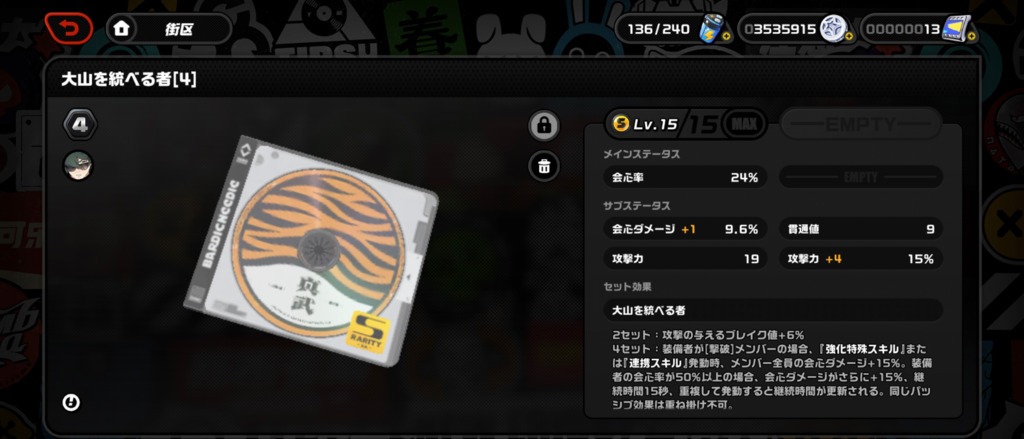 恐らくパッシブの条件満たす為に攻撃3400必要で、大山装備だと会心率も50必要だから餅に攻撃%でも付いてないと6衝撃にする余裕なさそう。とりあえず自分は456全部攻撃%も用意しておくつもり